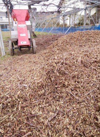 剪定した枝は、チッパー(粉砕機)で4mmほどに砕きます。 これを半年寝かせて堆肥にし、畑に戻します。自然リサイクルを推進しています。